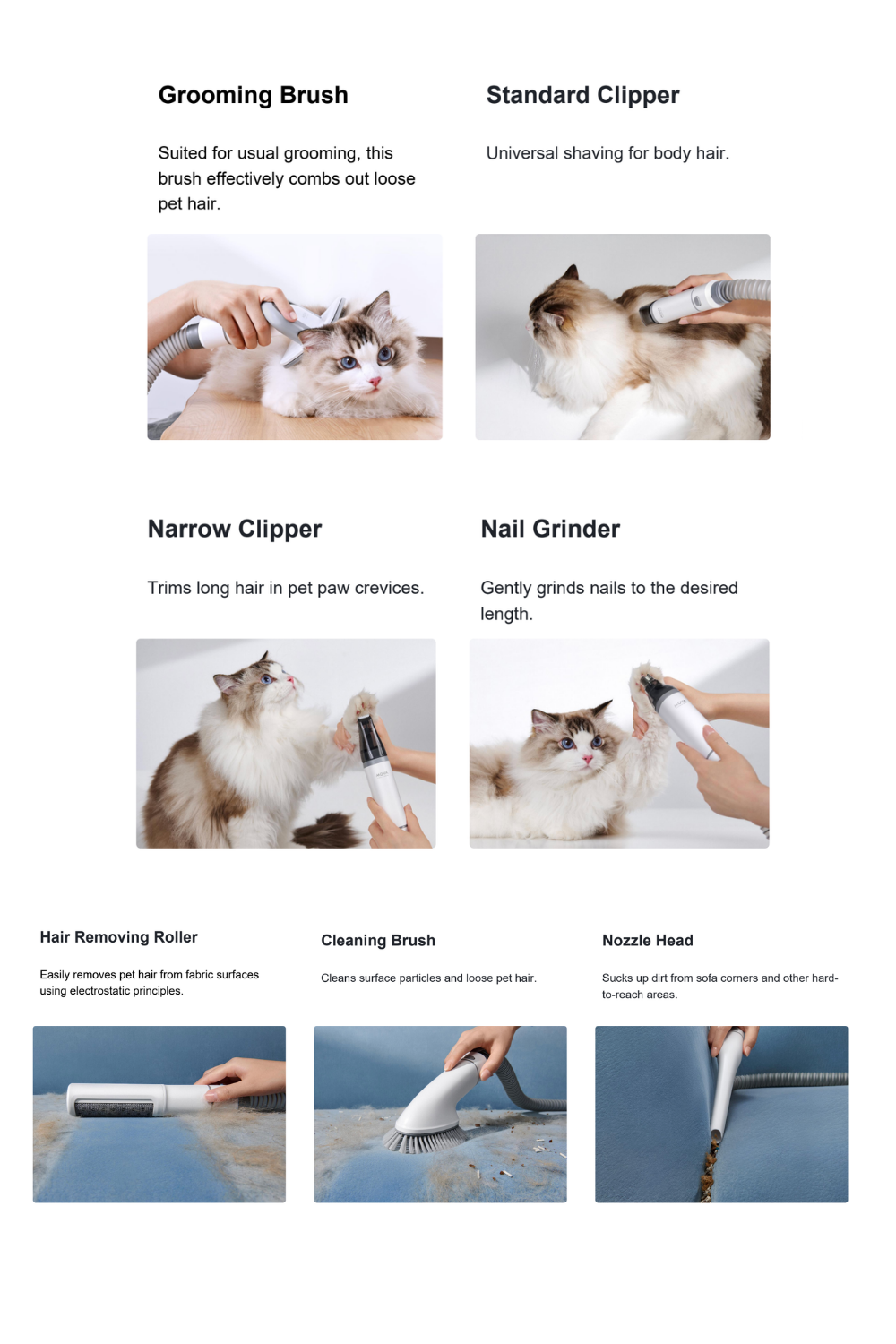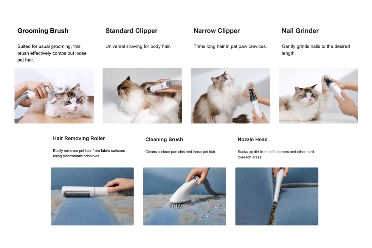 A complete professional grooming kit featuring 7 versatile tools: Grooming Brush, De-shedding Tool, Standard Clipper, Narrow Clipper, Nail Grinder, Hair Removing Roller, and Nozzle Head for head-to-paw care. -