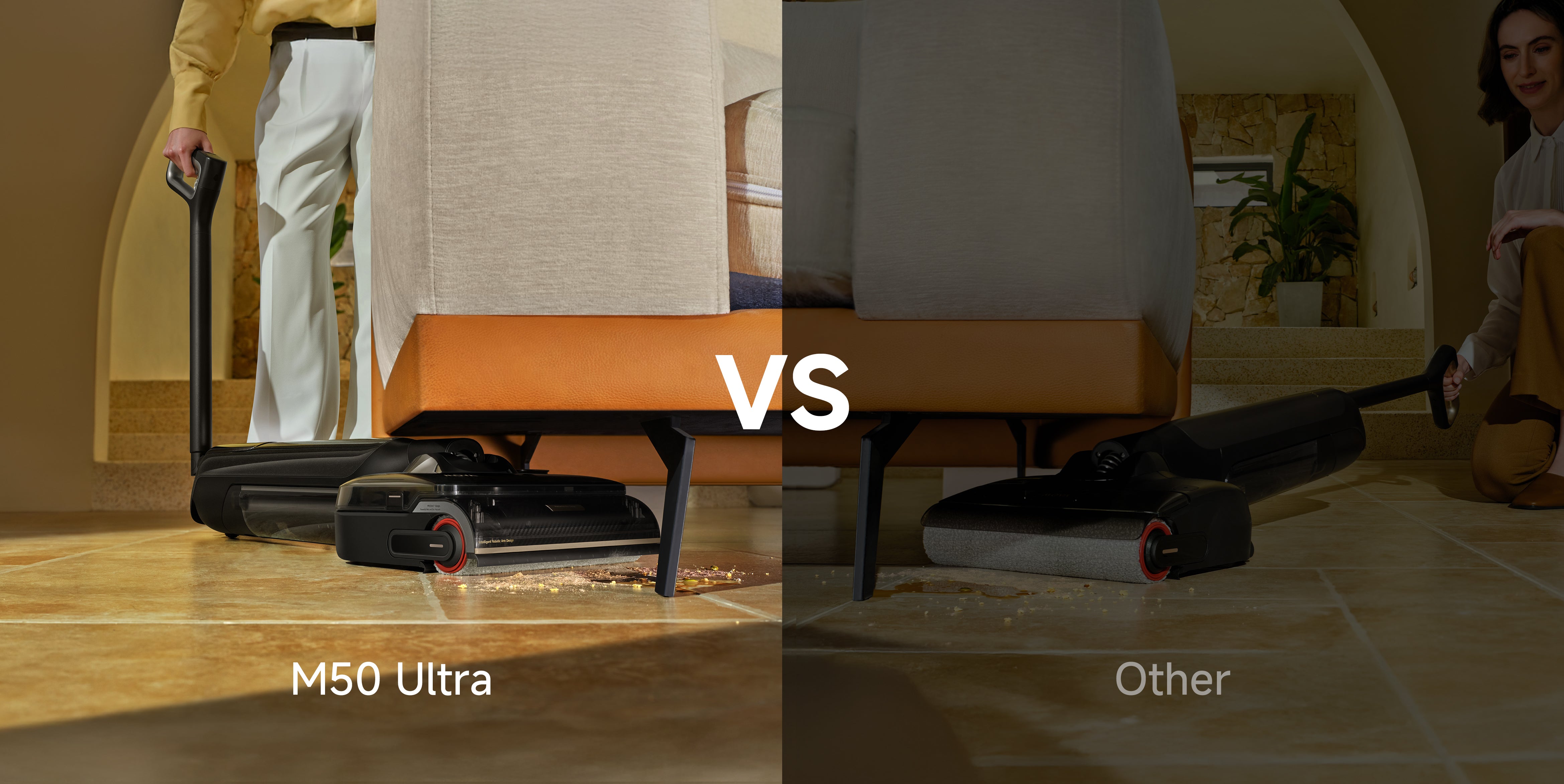 M50 Ultra’s EdgeCoverage AI utilizes a smart arm on the roller brush to clean tight front wall edges, delivering true zero-gap cleaning on all sides.